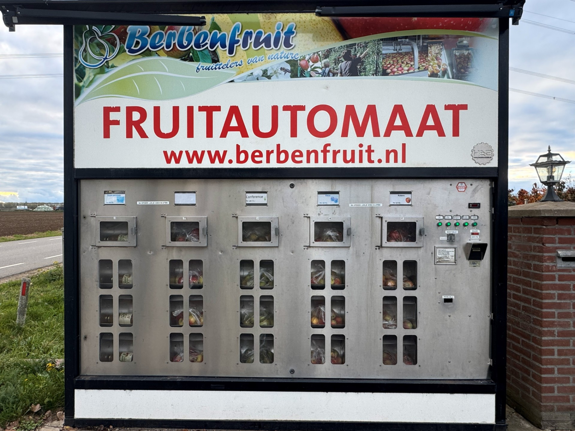 Aanleiding voor het bezoek is de kanjer van een Goudreinet die hij heeft geoogst. “We hebben hier maar een paar rijtjes van, vooral bedoeld voor de verkoop in onze fruitautomaat”, zegt Jan-Willem Berben. Veel consumenten weten de fruitautomaat goed te vinden. Maar de meeste appels en peren leveren zij aan Fruitmasters. Berben Fruit teelt acht verschillende appelrassen, waaronder Delcorf, Tessa, Kanzi, Elstar en Royal Gala. Ook peren in diverse variëteiten: Migo, Conference en Triomphe de Vienne.