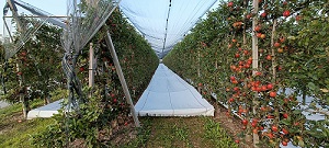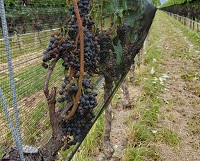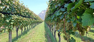 Mijn stagebedrijf is hier in de regio een van de eerste die begonnen is met hagelnetten voor de druiven, want ook deze kunnen beschadigingen in de stevige hagelbuien die hier kunnen vallen. Deze beschadigingen hebben een negatief effect op de smaak van de wijn. Er wordt bij de druiven gekozen voor het Whailex hagelnetsysteem. Dit houdt in dat de netten verticaal aan de zijkant van de ranken zitten en niet, zoals bij de appels, over de gehele plantage.