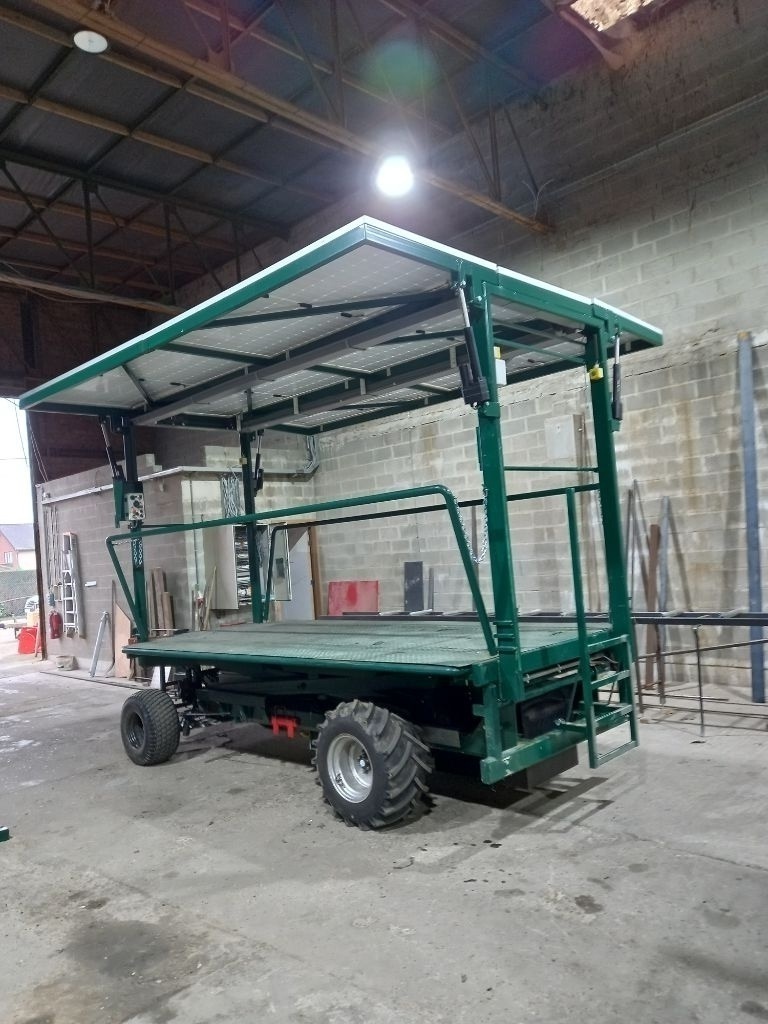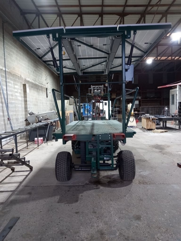GA VOOR CO2 VRIJ EN GELUIDS ARM foto 1,2 en laatste de 2 electrische plukwagens van Jan Lowet komen niet uit het veld om batterijen op te laden ..Worden enkel geladen met de zonnepanelen