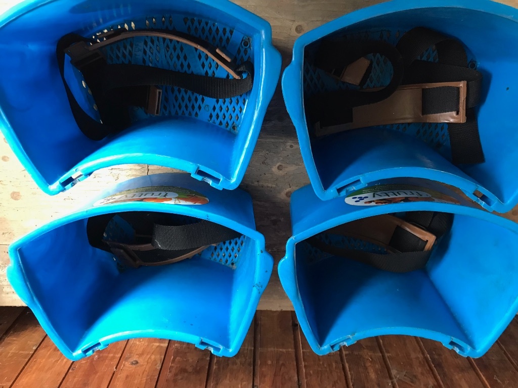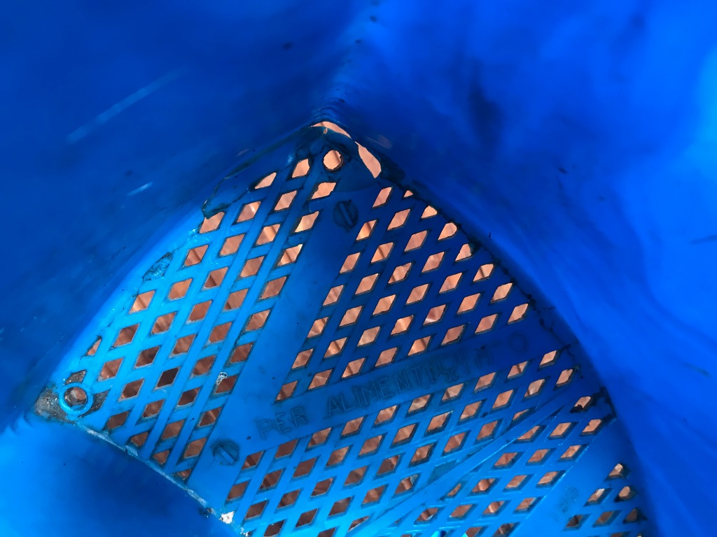 elke mand is voorzien van een draagriem, de emmer is van blauw kunststof. 1 emmer heeft een kleine breuk in de hoek van de bodem.
