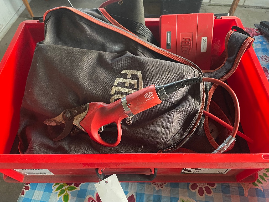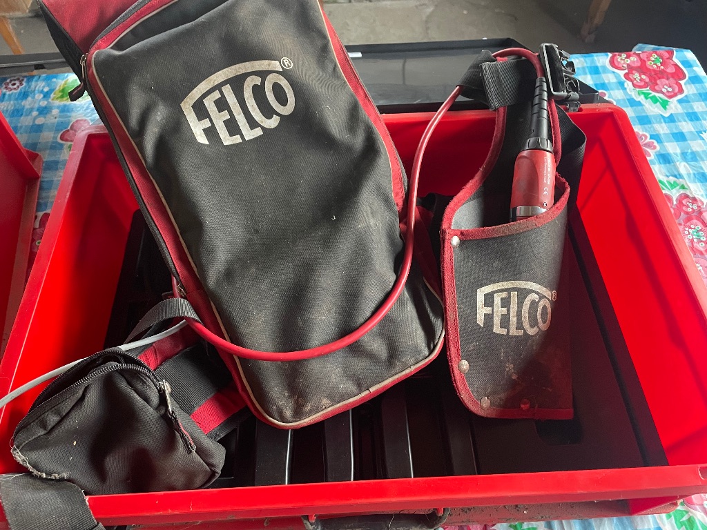 Twee Felco elektrische snoeischaren te koop Eén ouder type met een driehoekige accurugzak en een nieuwer type met een rechthoekige rugzak. Inclusief laders en koffer. Eén dikke batterij(2016) twee dunne