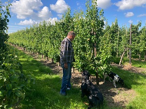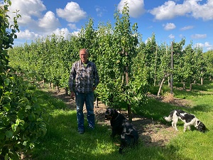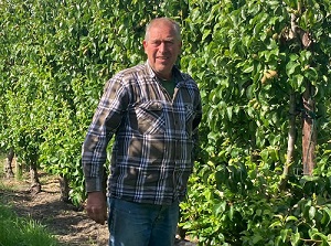 Wim Vriend (60) in Hem teelt op 20 ha Conference. “Ook nog 2 ha Comice, maar dat is bijzaak.” Daarnaast heeft hij, samen met zijn broer en vrouw, nog een loonbedrijf waar ook hun zoon Erik werkt. Eigenlijk was Vriend helemaal niet van plan om fruitteler te worden. “Ik ben opgeleid tot staalbouwer. Maar daar was halverwege de jaren ’80 geen werk in te vinden. Ik hielp thuis natuurlijk al mee. Toen mijn vader het perceel van de buren erbij wilde kopen, ben ik thuis gaan werken.” In de samenwerking met zijn broer is hij degene die de teelt regelt. “Ik heb geen agrarische opleiding. Ik heb het vak thuis, van mijn vader, geleerd. Ondanks zijn leeftijd (83) komt hij nog vrijwel dagelijks helpen. Ik overleg ook nog vaak met hem.”