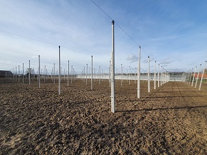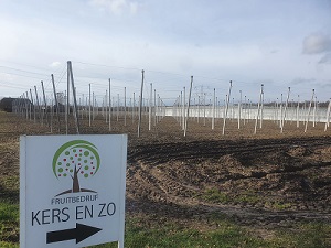 De palen staan keurig in het gelid, bij Ruud Barten van Kers En Zo in Sint Hubert. Ook de gewasdraden zijn aangebracht. Het perceel, van 0,8 ha, is klaar om de jonge kersenbomen te ontvangen. Hij heeft het werk grotendeels zelf gedaan. “De materialen zijn geleverd door FSH. De palen zijn door een ander ingetrild, de rest heb ik zelf gedaan. FSH heeft een goede helpdesk. Dan kun je zelf best veel.”